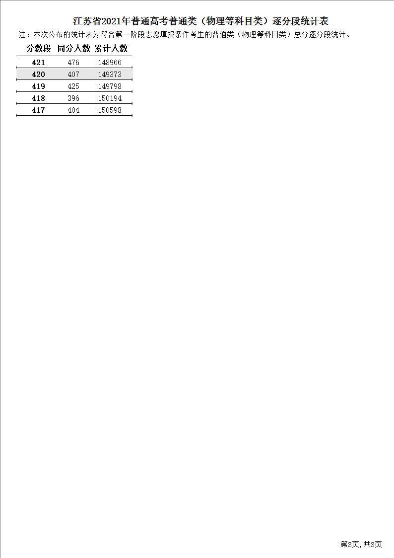 2021江苏物理一分一段表