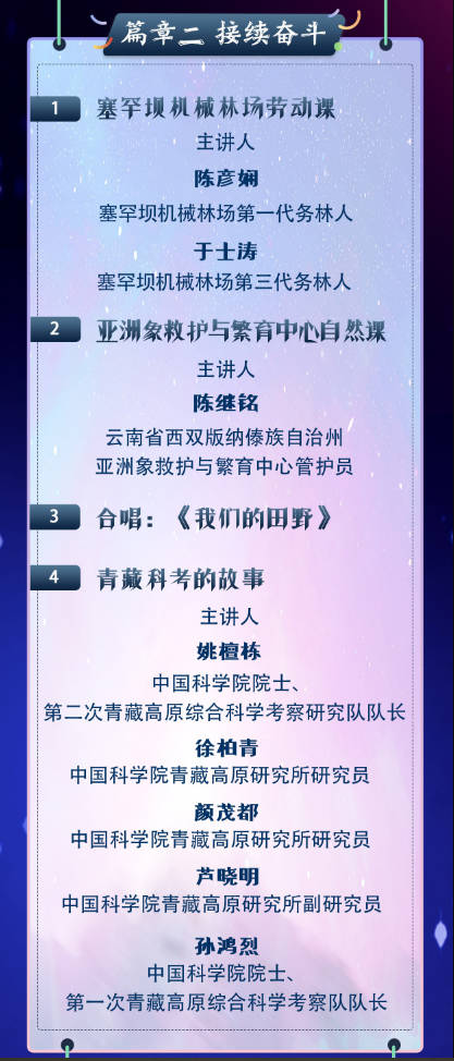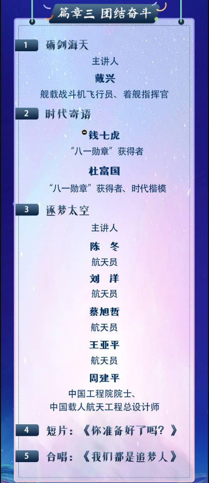 节目中,冬奥运动员及工作人员也集体出镜,阐述他们为梦想奋斗的故事;首位女航天员刘洋等学生耳熟能详的名人讲述太空之美、地球之美、人性之美。此外,乡塞罕坝机械林场务林人等也亮相,他们经过60年的奋斗,一锹一铲地攻坚造林,在一片荒原上种植出了全球面积最大的人工林场,创造了人类历史上最伟大的绿色奇迹;西双版纳亚洲象救护与繁育中心救护亚洲象,青藏科研人员讲述"科考"的奋斗故事;八一勋章获得者钱七虎、杜富国为国家、为人民作奉献,他们是时代的楷模。